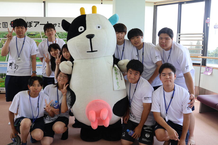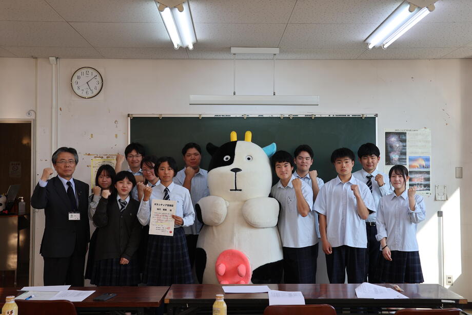 今年から始まった高校生ボランティアに委嘱状を交付したモーッ♪一緒に町の魅力を発信するモーッ♪