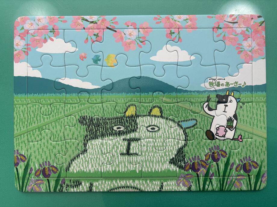 あーさー♪のオリジナルジグソーパズルを町内幼・保育施設に寄贈したモーッ♪(写真:認定こども園ぶどうの木)