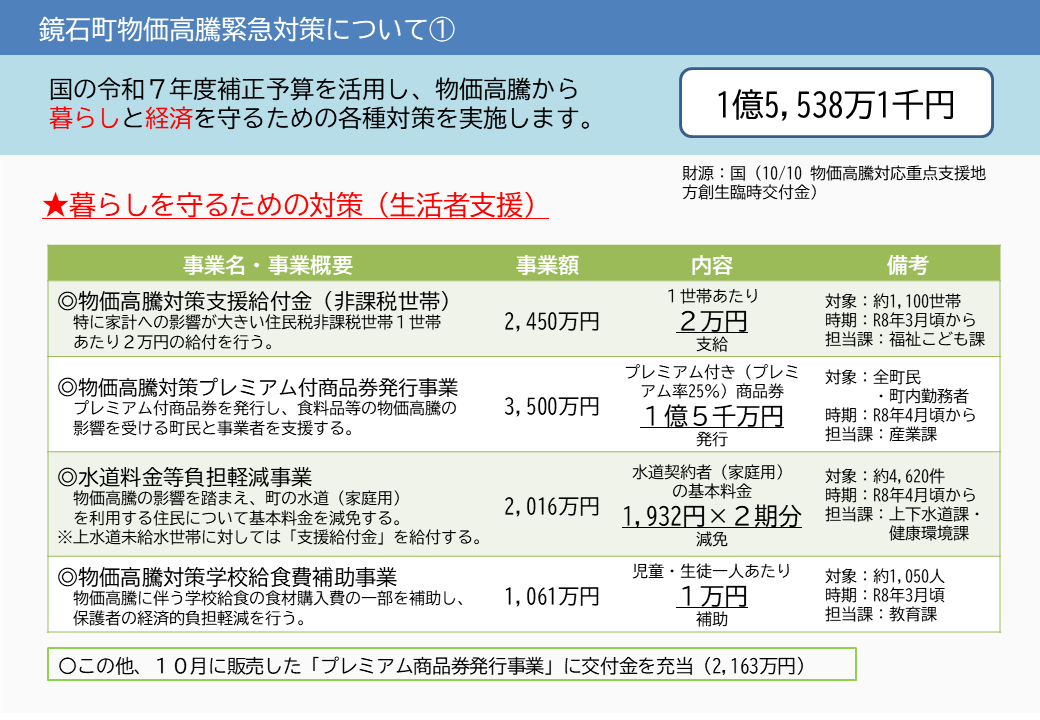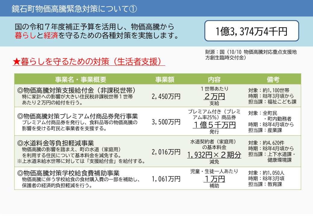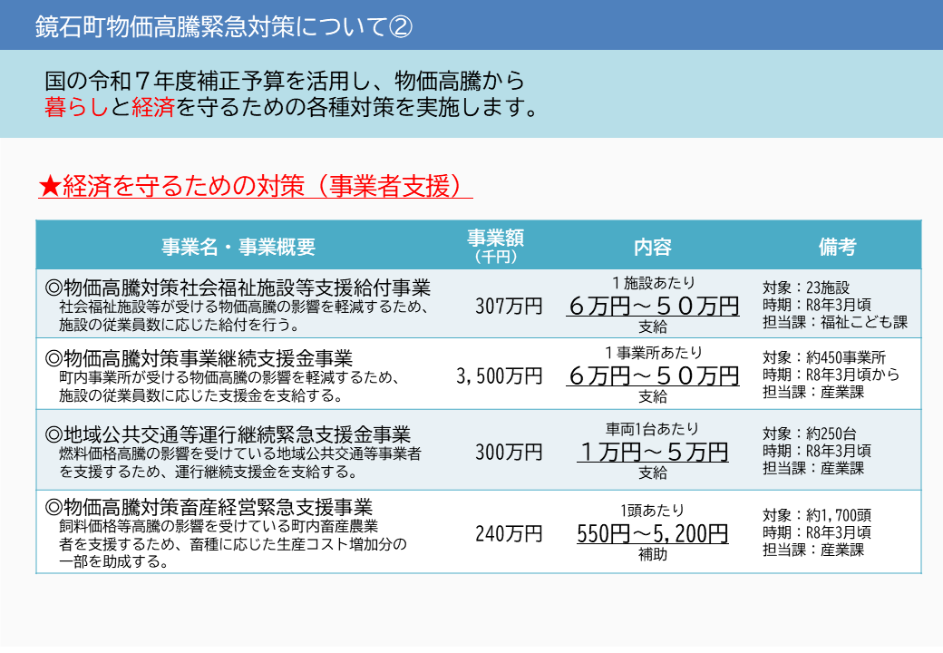 令和7年度国補正予算の成立を受け、国の交付金を活用した、物価高騰から暮らしと経済を守るための各種対策を実施します。