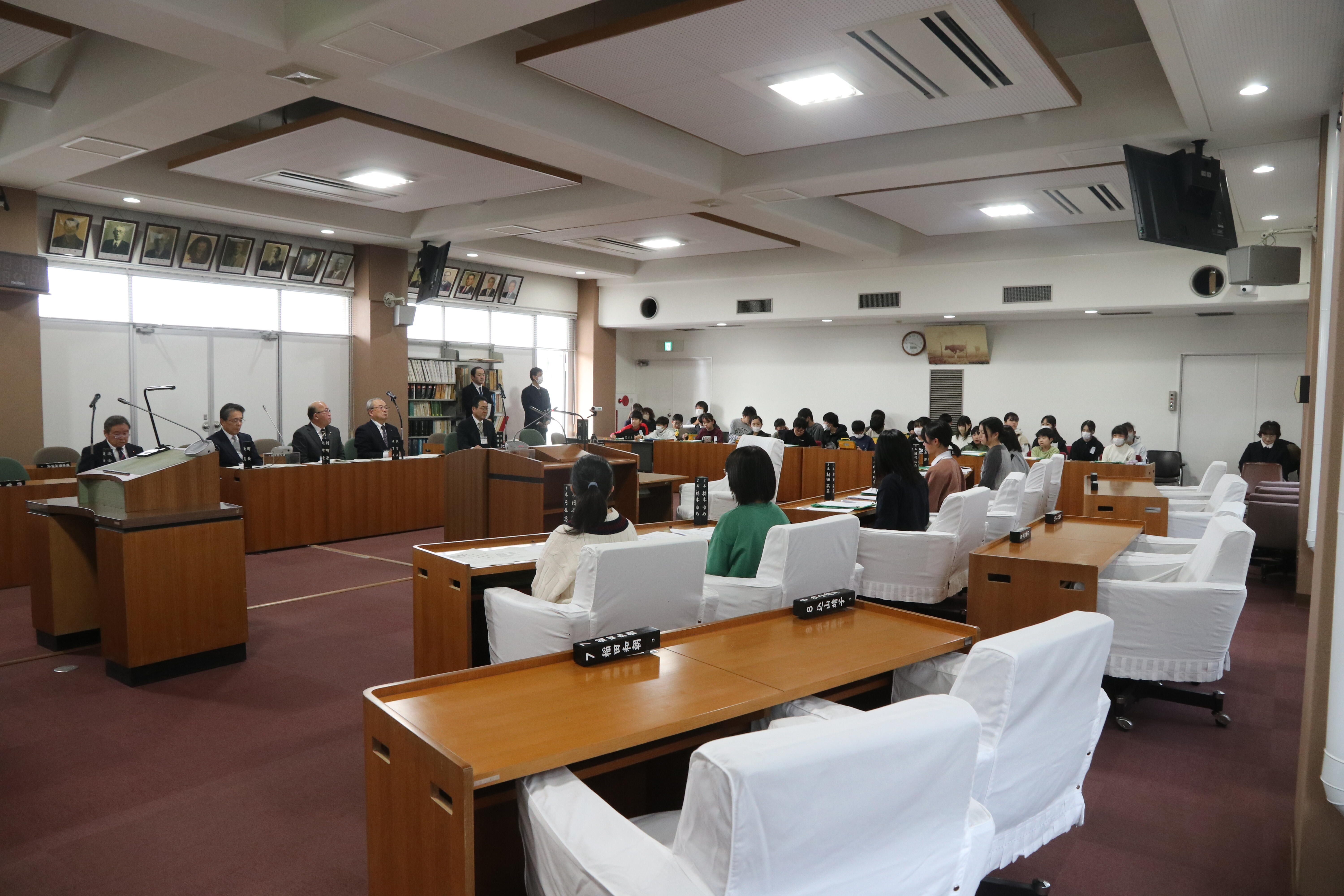 当日は、各小学校の代表(第一小学校6年生6名、第二小学校6年生5名)が子ども議員として参加し、町に対する意見や要望を述べます。