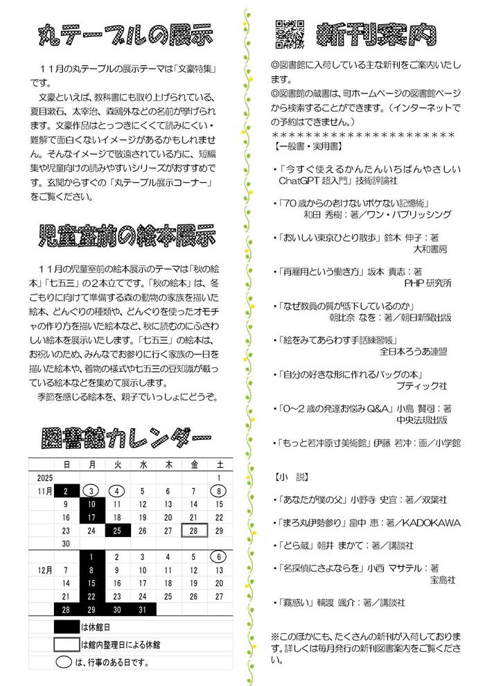 今後の感染症の状況によって、図書館サービスに変更が生じた場合は、「今月の図書館からのお知らせ」ページにてお知らせいたします。