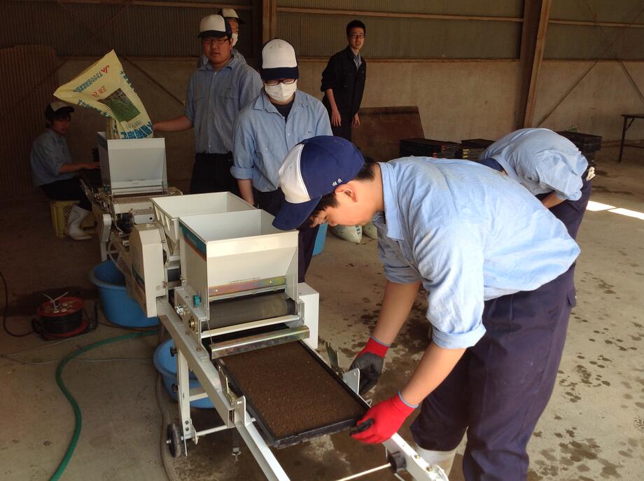 種をまく苗箱に培土を入れていきます。少し水気を含ませています。