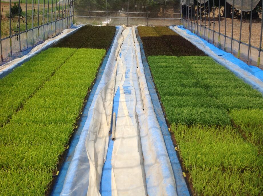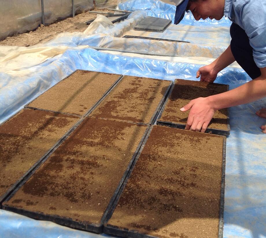培土をかぶせた苗箱はそのままハウスへ。丁寧に並べられています。