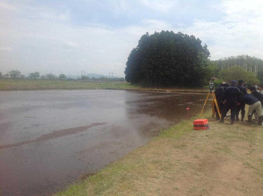 5月26日、快晴。田植え祭りが終わり、今度は下の田んぼ(文字部分)の測量です。