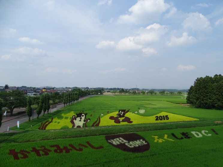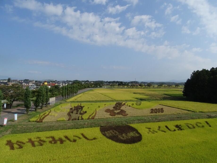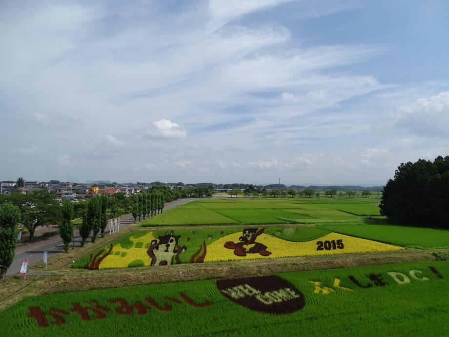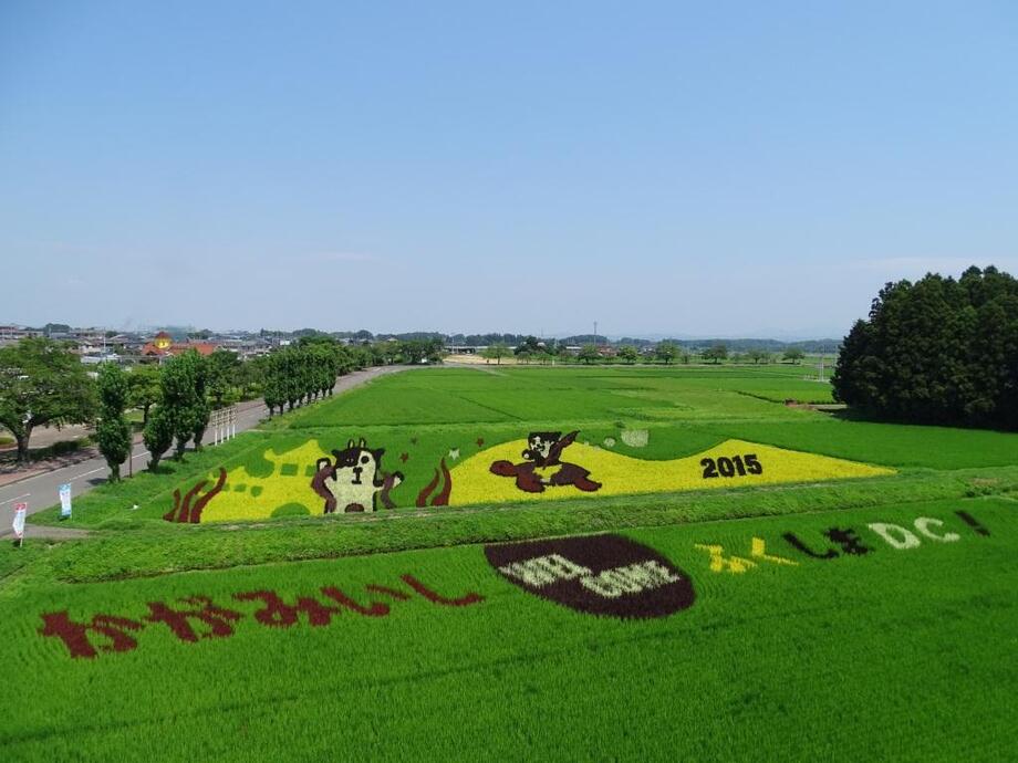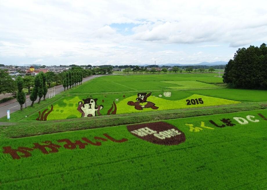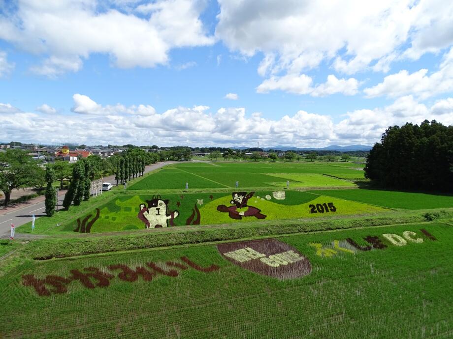小さな苗一つ一つが創り出す、大きな農の芸術「かがみいし田んぼアート」。今年も皆様のご来場をお待ちしております。(写真は2015年8月3日撮影)