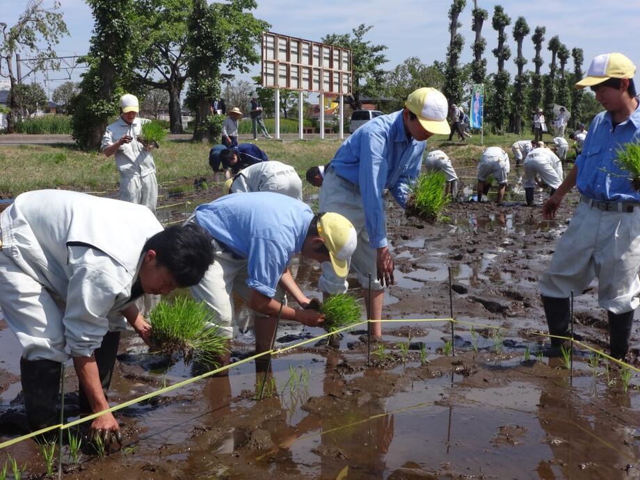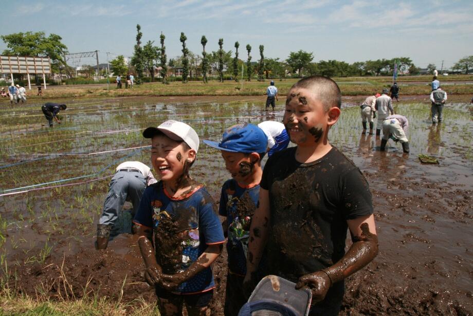 「もう少し右…OK!」田んぼに元気な掛け声が響き渡ります。