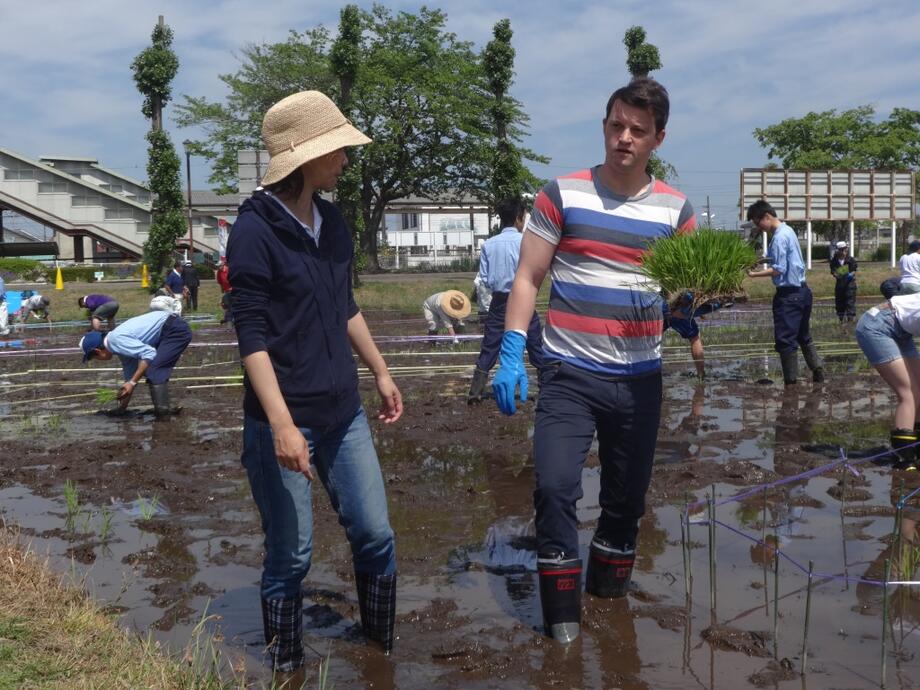 外国人の方々にも参加していただきました。田んぼアートを通じた国際交流ですね!