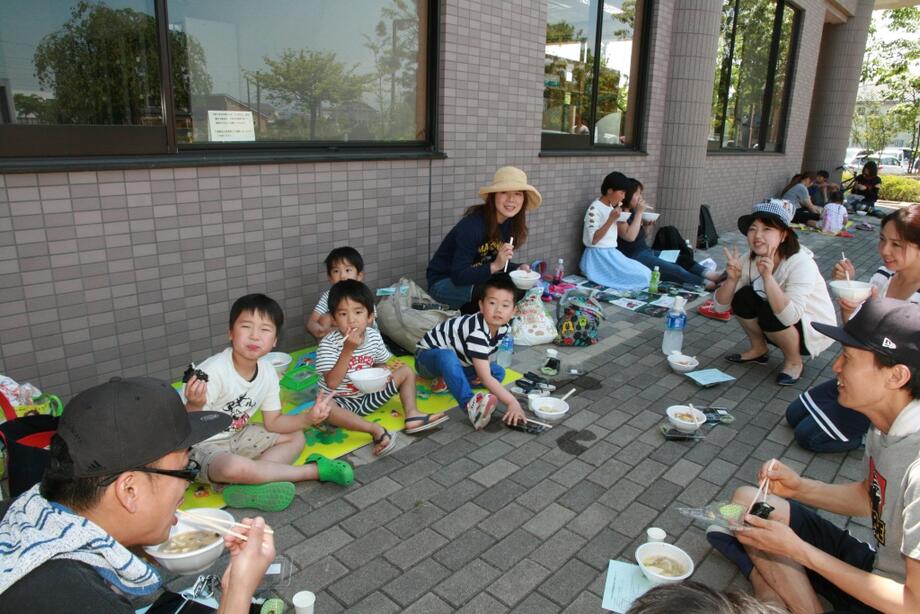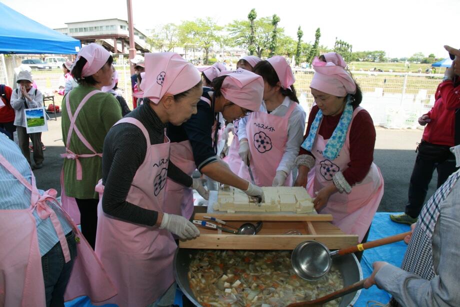 そろそろお昼ご飯。町のヘルスメイトの皆さんが手作りの豚汁を用意してくれています。