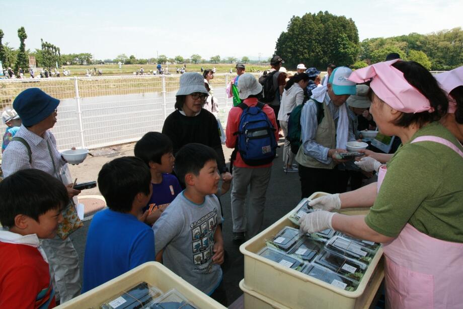 豚汁と一緒に田んぼアート米を使用したおにぎりが参加者に配られました。