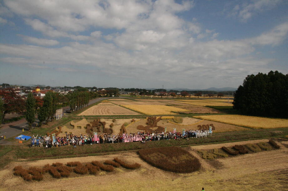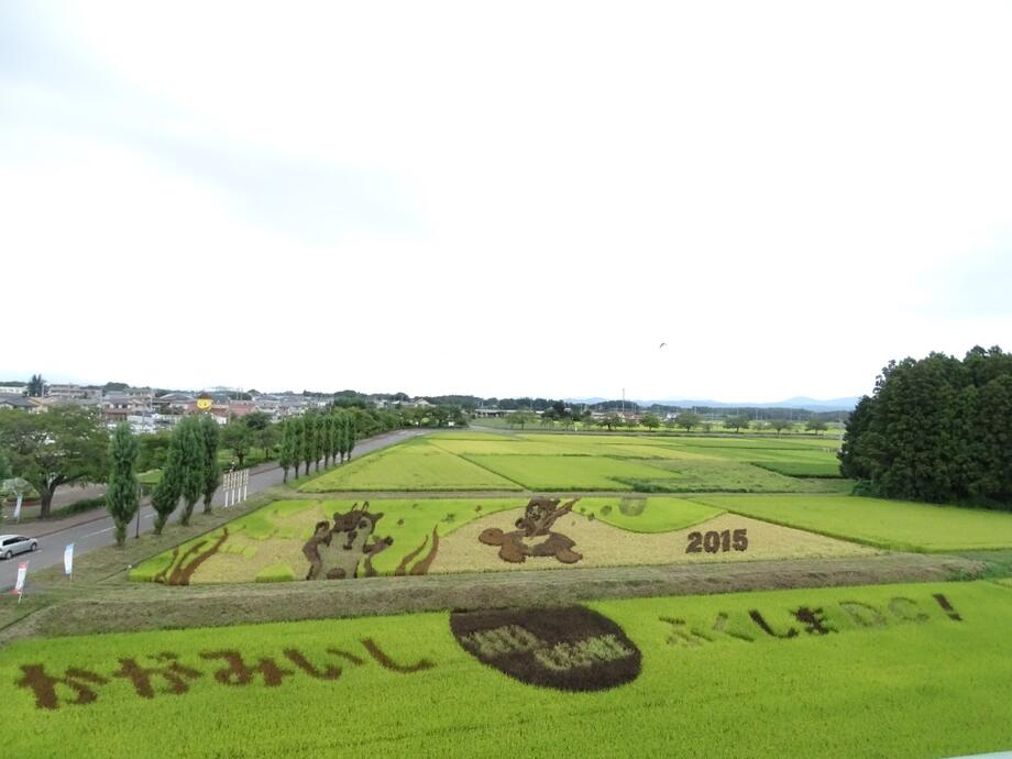 今年は「ふくしまデスティネーションキャンペーン(DC)」本番の年であることから、浦島太郎を観光客に見立て、乙姫に扮した町の公式キャラクター「牧場のあーさー♪」がお出迎えする構図となっています。さらに下の田んぼ部分には「かがみいし WELCOME ふくしまDC!」のメッセージを配置しました。アートの見ごろは7月から8月です。